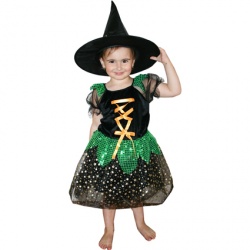Kostým zahrnuje překrásné nazdobené černé šatičky se zelenými prvky, žlutou stuhou a černý čarodějnický klobouk.