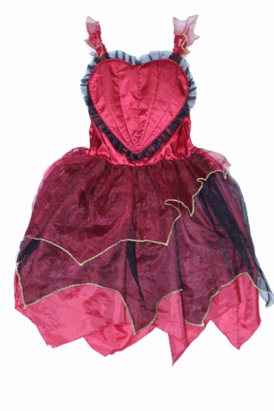 Dětský kostým čarodějky s velkým srdcem na prsou.